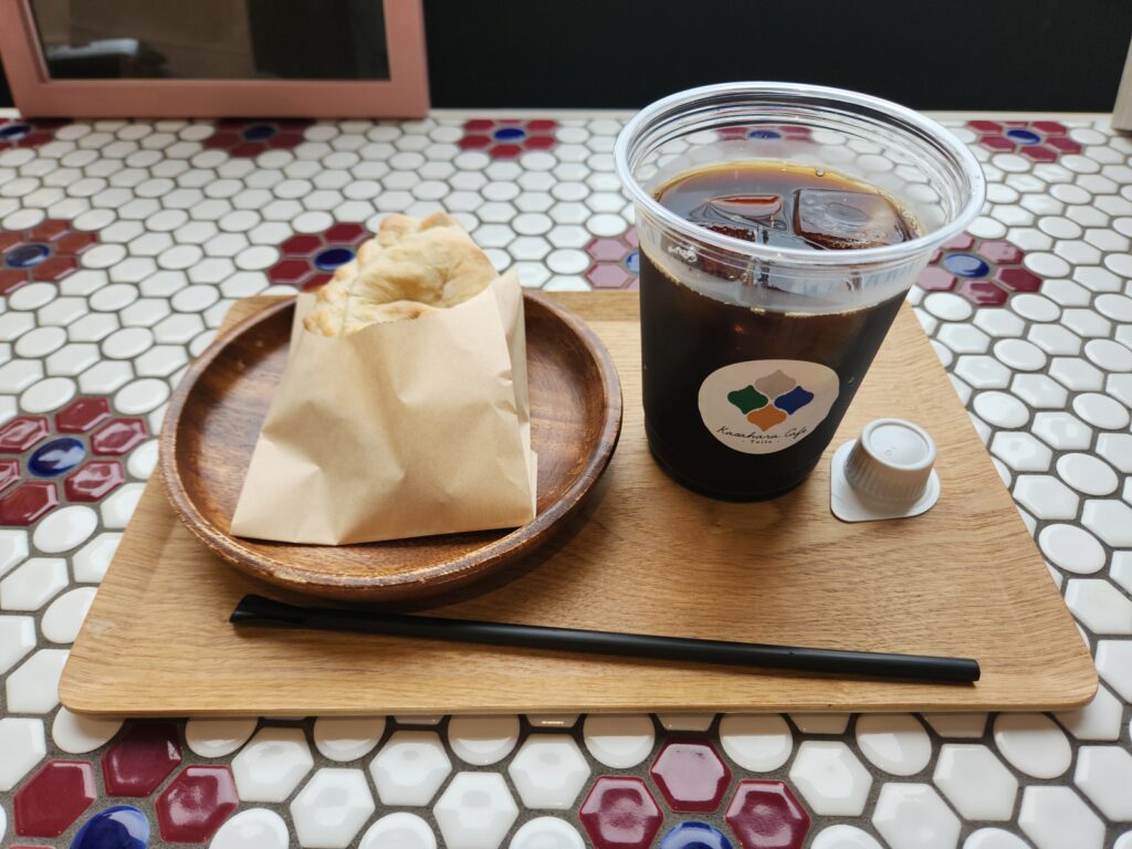 まず、広場に面した公民館の1階にあるKasaharaCafe tuileというカフェ。店内やテラス席の床、テーブルにモザイクタイルが敷き詰められており、見ているだけでもかわいらしいお店です。フードメニューも充実していて、私は包み焼ピザとアイスコーヒーをいただきました。焼きたてのピザは、生地がもちもちで具もたっぷり!食べ応え抜群でした。