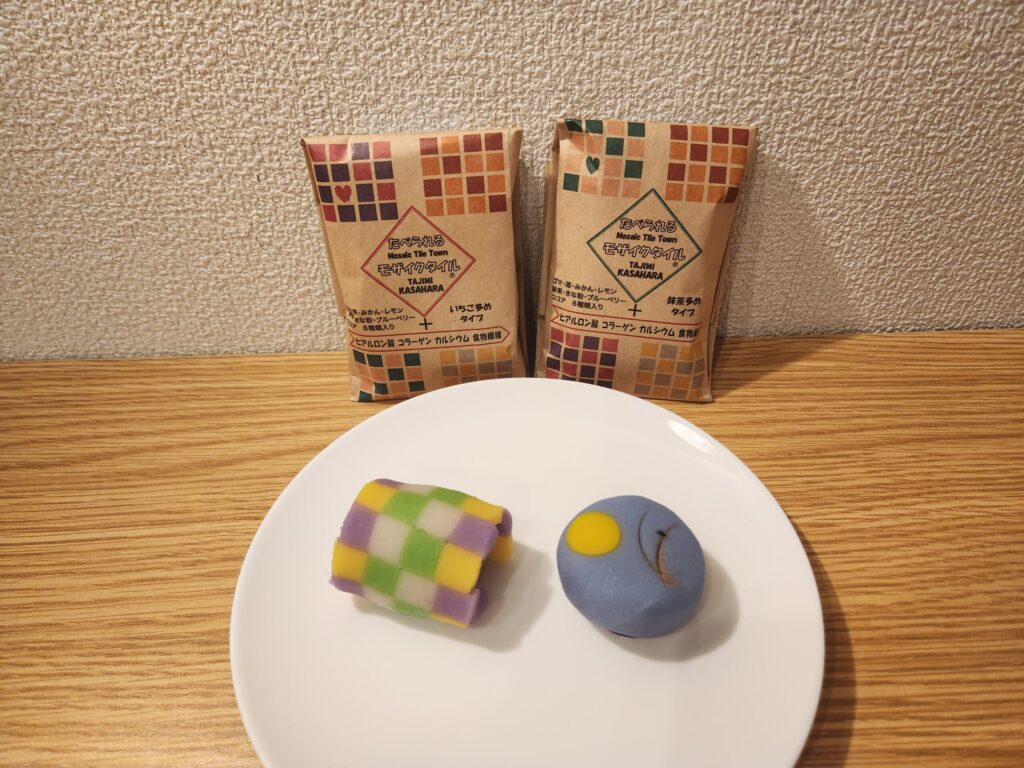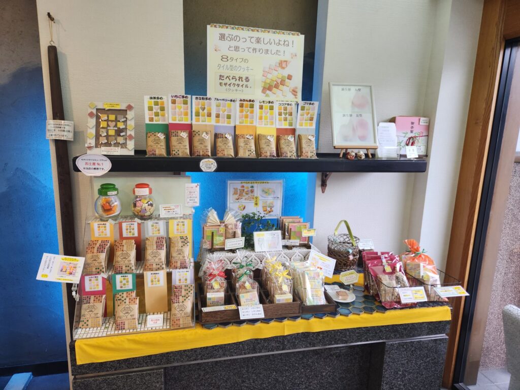 そして、モザイクタイルミュージアムから歩いて3分ほどのところにある和菓子屋さん、陶勝軒。モザイクタイルで装飾された外壁が目印になっています。モザイクタイルの使われているかわいらしい店内も魅力的ですが、なんといってもお土産に最適な「たべられるモザイクタイル」を販売しています。日持ちのするクッキーが人気ですが、こはく糖や上生菓子の彩り、おまんじゅうも、見た目もかわいくておいしいお土産です。たべられるモザイクタイル以外にもオリジナルの和菓子がたくさん販売されていて、私も思わず購入してしましました。