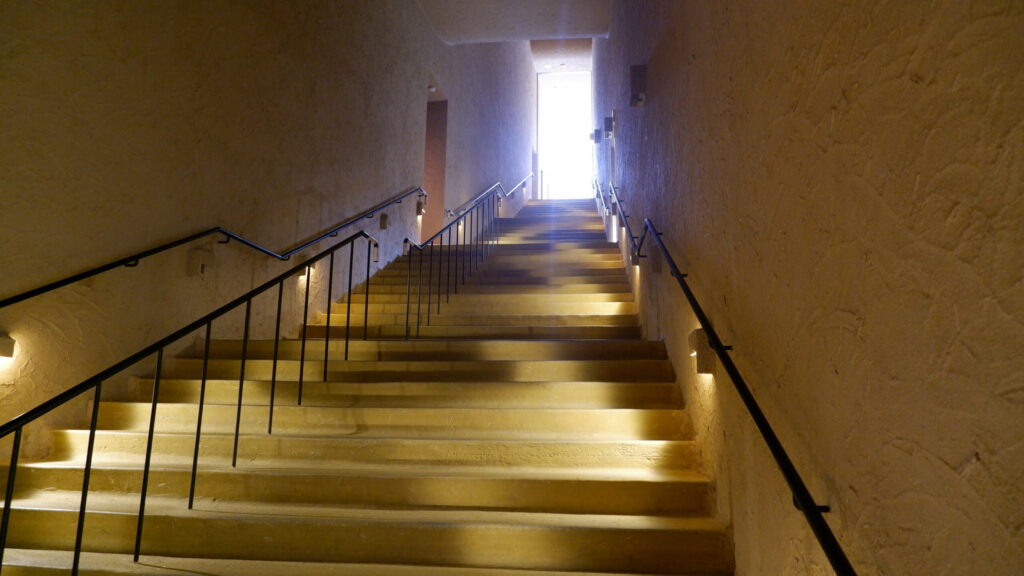 まずは4階の展示室1へ向かいます。もちろんエレベーターもありますが、4階まで続く階段は壁の素材感も相まってまるでトンネルの様です。薄暗い階段を4階の光に向かって上っていきます。