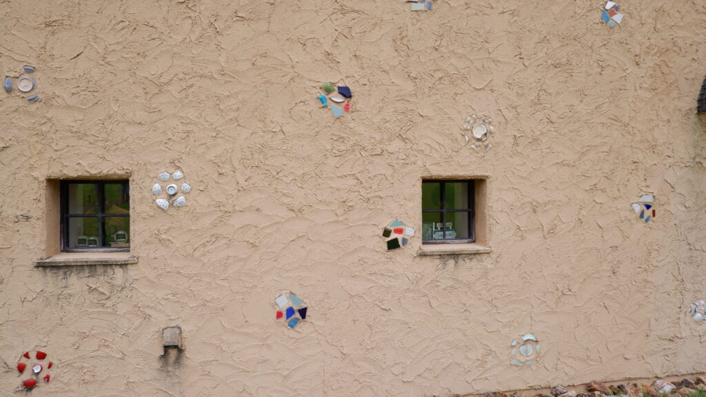 広場から入口までは、すり鉢状でまるで吸い込まれるよう。小さな入口に近づくにつれて、建物に埋め込まれたタイルが見えてきます。
