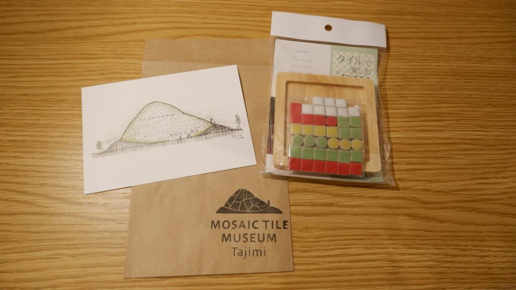 1階は体験工房とショップがあり、入館料なしで入ることができます。体験工房は多くの人でにぎわっていました。ショップにはモザイクタイルを用いたアクセサリーや雑貨の他、モザイクタイルの詰め放題もありました。モザイクタイルを使った工作キットもたくさんあり、DIY好きにはたまりませんね。私はコースターが作れるDIYキットとモザイクタイルミュージアムのスケッチが描かれたポストカードを購入しました。